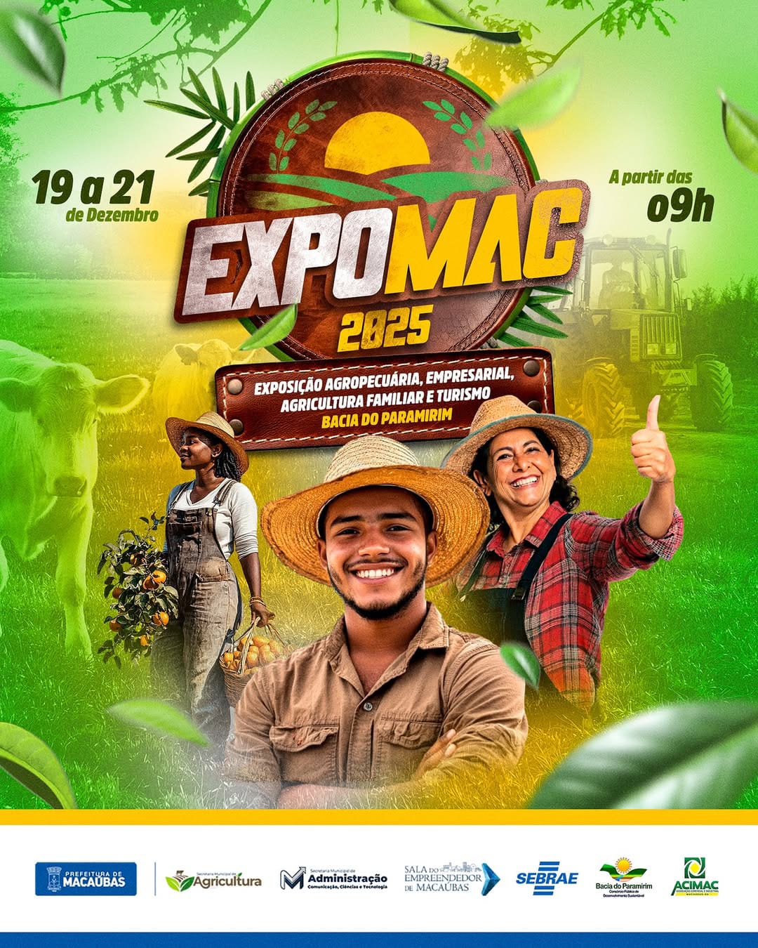 De 19 a 21 de dezembro, Macaúbas recebe a Exposição Agropecuária, Empresarial, da Agricultura Familiar e do Turismo — um evento que celebra a força produtiva da nossa terra e o potencial de quem faz o município e todo o território da Bacia do Paramirim crescer!