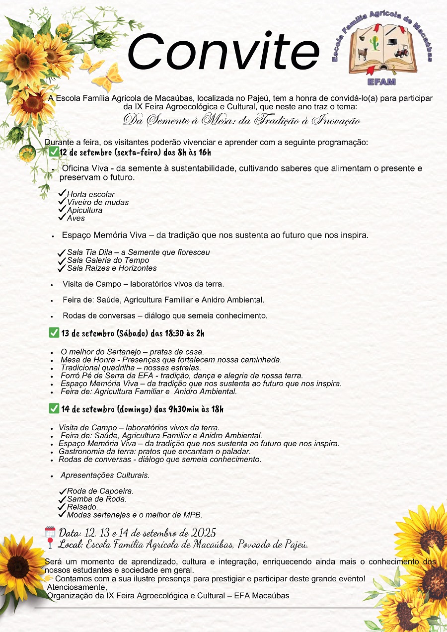 A Escola Família Agrícola de Macaúbas, localizada no Pajeú, tem a honra de convidá-lo(a) para participar da IX Feira Agroecológica e Cultural, que neste ano traz o tema: Da Semente à Mesa: da Tradição à Inovação.