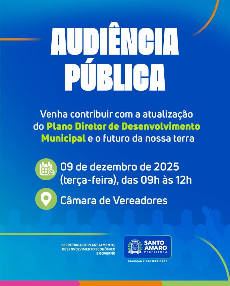 SANTO AMARO: PARTICIPE DA AUDIÊNCIA PUBLICA DE ATUALIZAÇÃO DO PLANO DIRETOR Postado por M.C.S. | dez 8, 2025 | BAHIA, SANTO AMARO | 0 | CONVITE: Compartilhar